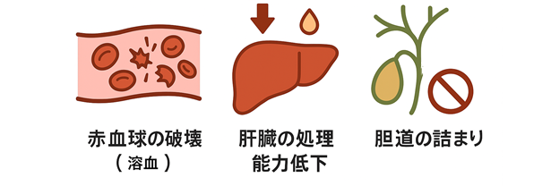 肝臓の働きの悪化により胆汁の代謝、排出ができなくなり、ビリルビンが上昇します。