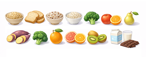玄米、全粒粉パン、雑穀米、オートミール、サツマイモ、ブロッコリー、リンゴ、オレンジ、グレープフルーツ、キウイ、洋ナシ、無糖ヨーグルト、チーズ、牛乳(低脂肪または無脂肪)、ダークチョコレート(カカオ70%以上)