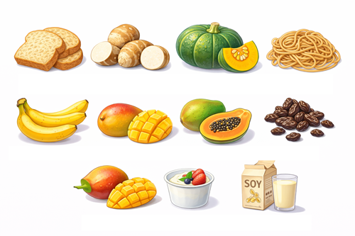 玄米パン、さといも、かぼちゃ(品種による)、全粒粉のパスタ、バナナ(熟したもの)、マンゴー、パパイヤ、レーズン、無脂肪ヨーグルト(加糖)、豆乳(加糖タイプ)