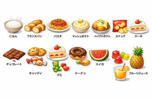 白米(炊いたもの)、フランスパン(バゲット)、パスタ、ジャガイモ(マッシュポテト、ベイクドポテト)、スナック・甘味、クッキー、ケーキ、ドーナツ、チョコレート、飴、グミ、スイカ、パイナップル、果物ジュースなど