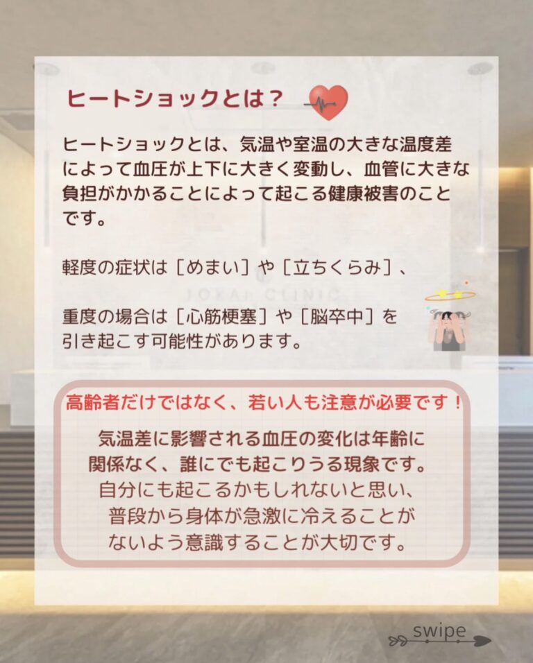基礎疾患などがない健康な人、若い人でも自律神経が乱れやすいとき(疲労、ストレス、睡眠不足、飲酒後など)は、ヒートショックを起こす確率が高まる為、年齢にかかわらず、若い人も油断禁物です☺