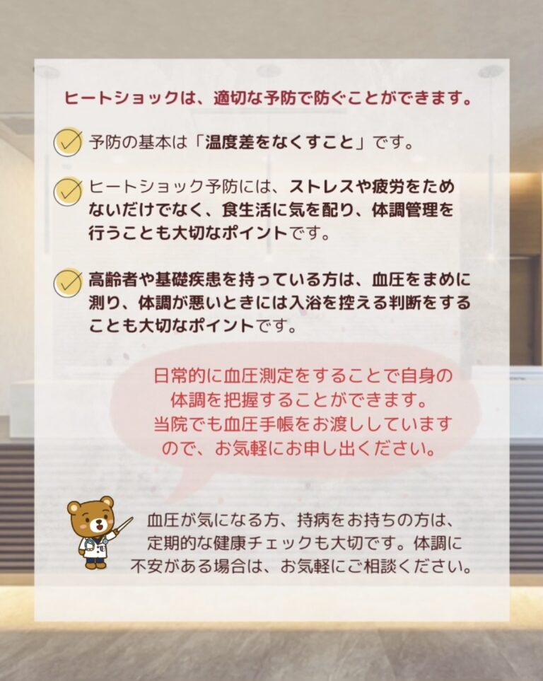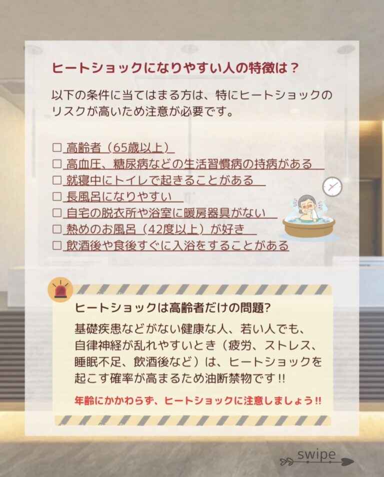✨高齢者や基礎疾患を持っている方は、血圧をまめに測り、体調が悪いときには入浴を控える判断をすることも大切なポイントです。