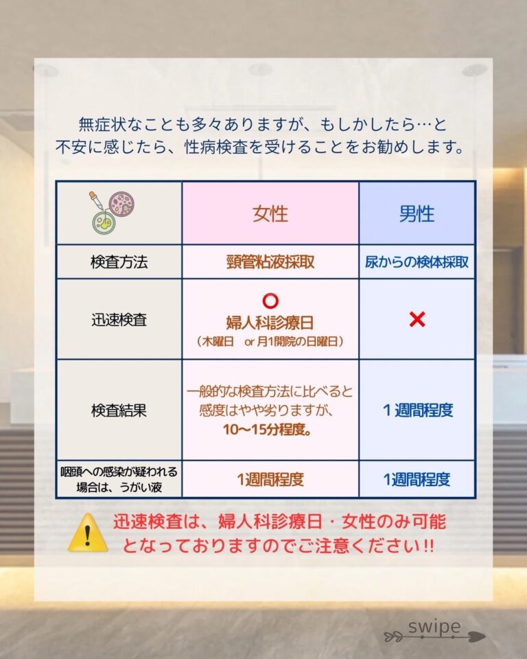 ✨女性の方限定、迅速キットでの検査が可能です。【婦人科診療日(木曜日、月1開院の日曜日)のみ。】 一般的な検査方法に比べると感度はやや劣りますが、10〜15分程度で結果が分かります。 ※検査の種類によっては当日結果がでないものがあります。