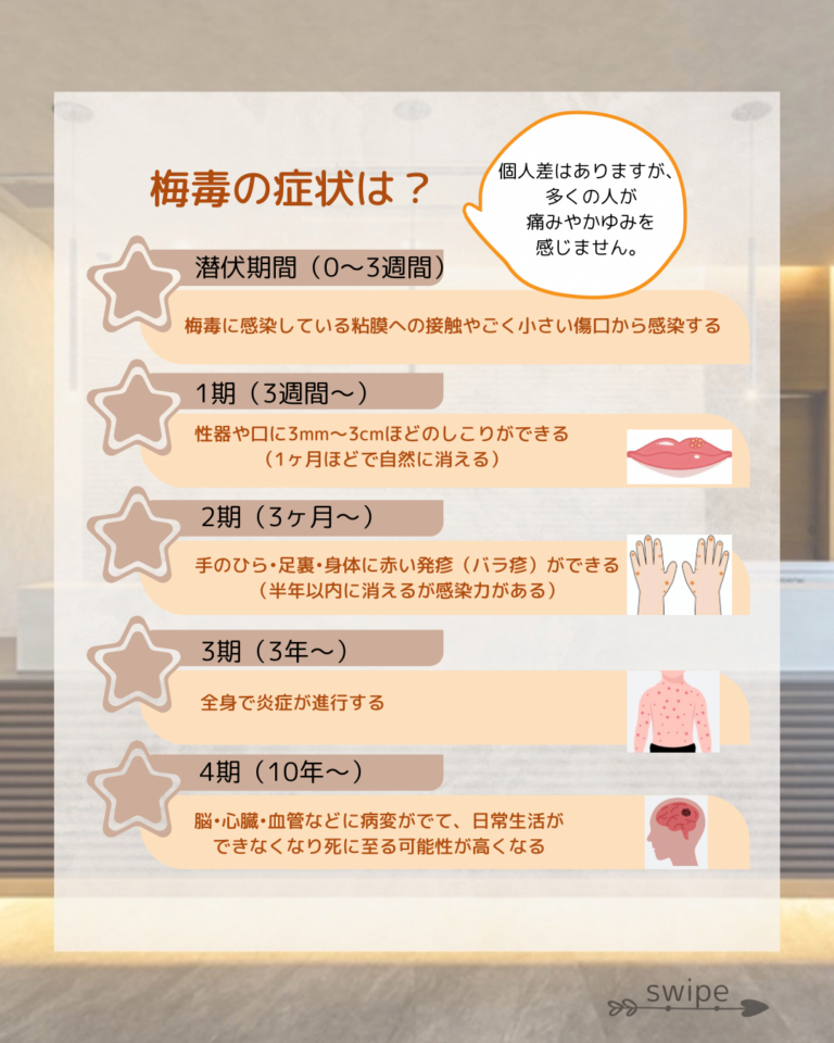 梅毒は早期に発見して、適切な治療を行うことで治癒が可能です。