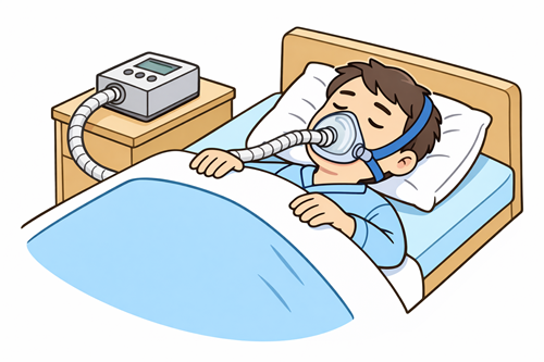 中等症以上の睡眠時無呼吸症候群(SAS)では、CPAP(持続陽圧呼吸療法)が標準的な治療です。就寝時にマスクを装着し