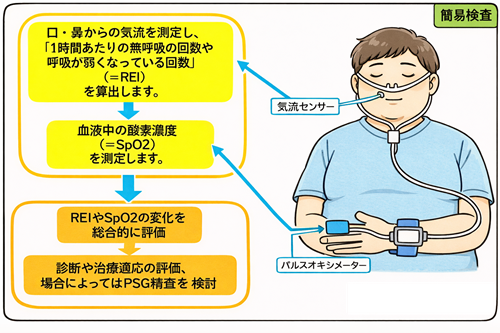 まずはご自宅で行える簡易検査で、睡眠中の呼吸状態や酸素低下の有無を調べます。指や鼻のセンサーをつけて一晩眠ることで、無呼吸・低呼吸の程度を評価します。SASが疑われる場合の初期評価として広く行われています。