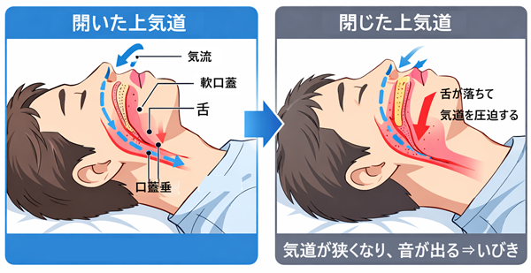 いびきは、のどや鼻の空気の通り道が狭くなり、振動することで起こります。